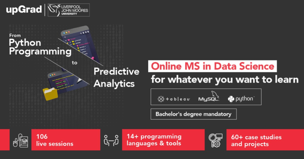 This Data Science course is integrated with Generative AI tools, you will get a chance to learn some extra tools like- ChatGPT, Open AI, Midjourney, Dall-E, Copilot, and Flask. This Data Science course from “UpGrad” offers an 18-month Course that has 5 specializations. This course is created by collaborating with 2 colleges; one is IIIT-Bangalore & other is LJMU(Liverpool John Moores University)-UK. You will get a Dual Degree; one is an Executive PG certificate from IIIT-Bangalore & other is a Master’s Degree From LJMU. This course provides the course content in blended format i.e. live as well as recorded. This course from UpGrad has top-notch Faculty from colleges IIT-B And LJMU & also have industry experts.